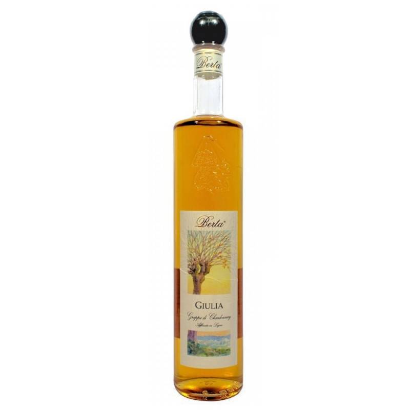 Grappa Giulia Distilleria Berta cl 70 di uve Chardonnay e Cortese affinata in botti di rovere di Slavonia per 10/12 mesi gusto morbido con sentori di vaniglia e frutta tropicale