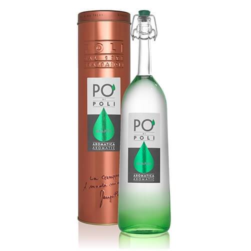 Grappa Aromatica Poli cl 70 da vinaccia di uve Gewürztraminer distillazione artigianale a piccoli lotti aroma di erba balsamica resina e spezie (pepe) gusto pieno deciso e persistente