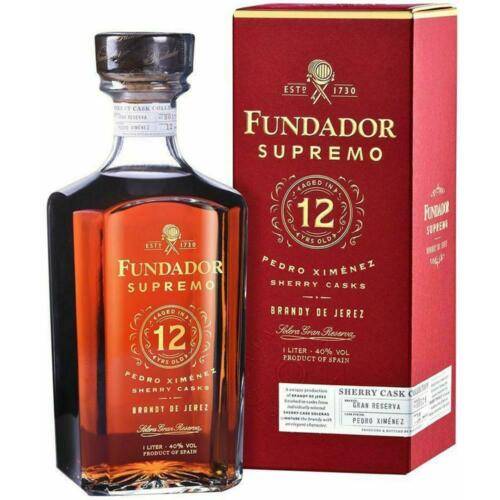 Brandy Fundador Supremo 12 anni cl 70 invecchiato in botti che hanno contenuto Pedro Ximenez per almeno 12 anni al naso note speziate di frutta secca vaniglia caramello e sentori di quercia morbido e vellulato al palato