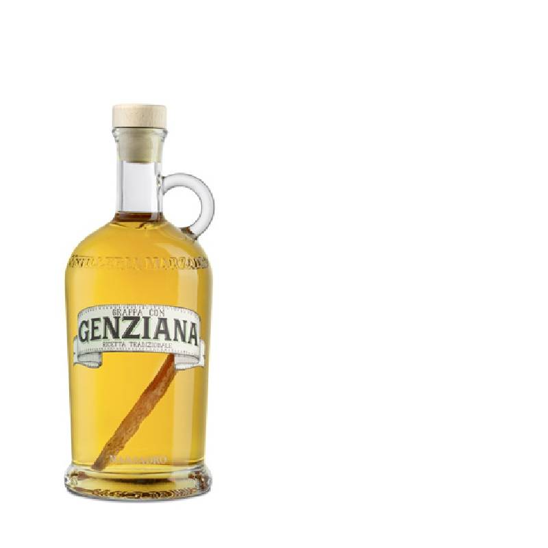 Grappa con Genziana Marzadro cl 50 ottenuta dall'infusione della radice di Genziana la cui raccolta avvine sul Monte Baldo in Trentino, con vinacce miste trentine selezionate gusto secco e aromatico