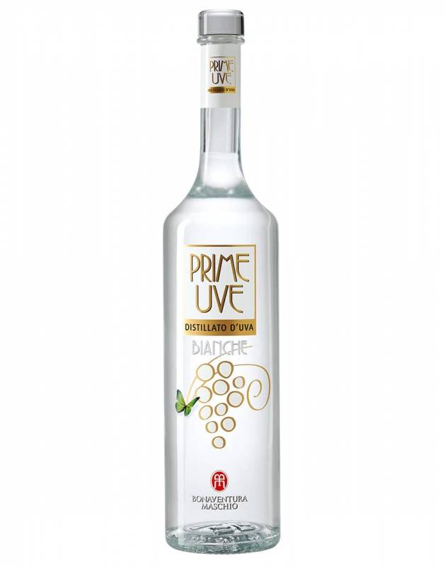 Distillato Prime Uve Bianche Maschio Bonaventura cl 70 dalla distillazione di uve bianche mature profumo fine fruttato e floreale misuratamente aromatico gusto pulito leggero armonico