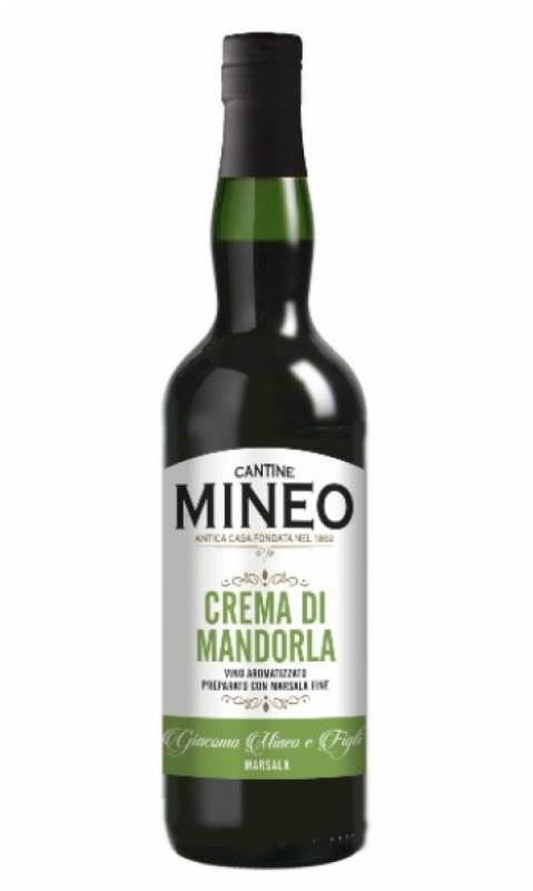 Crema di Mandorla Mineo cl 75 profumata preparata con Marsala Fine DOC e aromatizzata con estratti di mandorle amare usata in pasticceria per la preparazione di dolci e paste alle mandorle ottimo come dessert