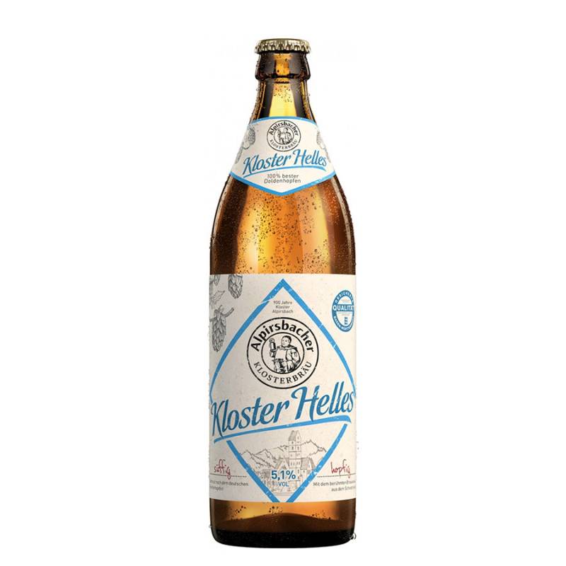 Birra Alpirsbacher Helles cl 50 colore giallo dorato ricco e caldo schiuma fine profumata di luppolo gusto fruttato perfetta armonia tra i dolci aromi di malto e l’amarezza lusinghiera del luppolo