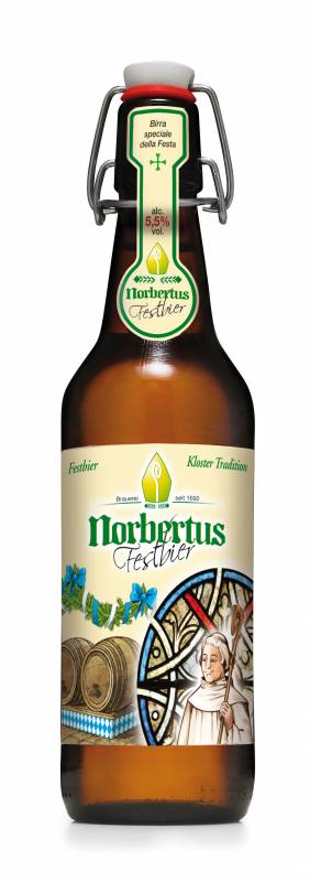 Birra Norbertus Festbier cl 50 tappo meccanico lager giallo dorato limpido aromi freschi gusto dolce fruttato e speziato si abbina con torte salate salumi focaccia e pizze al formaggio