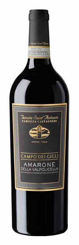 Amarone Campo dei Gigli Tenuta Sant'Antonio cl 75 da un' antica vigna, unico e pluripremiato, affina 3 anni in botte gusti intenso persistente di corpo robusto ottimo con carni rosse, selvaggina ma anche da degustazione