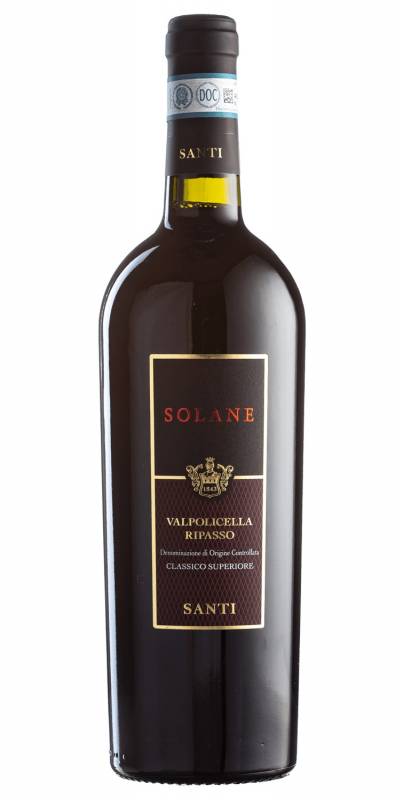 Vino Ripasso Valpolicella Superiore Solane Santi cl 75 profumo di frutta rossa fresca e di confettura di marasca sapore è genuino ed equilibrato con fondo speziato e persistente ottimo con carni rosse e selvaggina