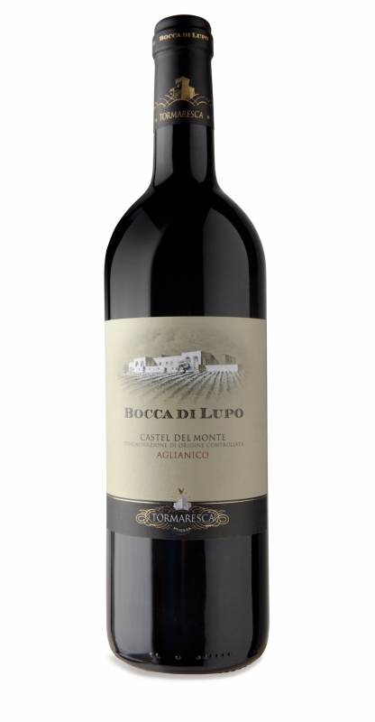 Vino Boccadi Lupo 2020 Tormaresca cl 75 da uve Aglianico coltivate in maniera biologica invecchia in barrique di rovere francese sapore di grande struttura e morbidezza ottimo con piatti di carne anche in umido e selvaggina