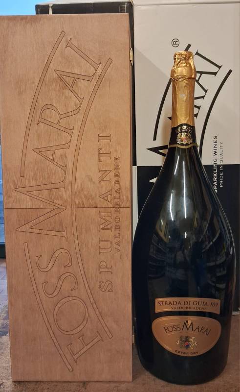 Spumante Fossmarai Extradry DOCG Strade di Guia 3 litri in cassa di legno ricco di profumi gradevole per l'armonia tra la freschezza ed il residuo zuccherino adatto a piatti leggeri e....in ogni momento !